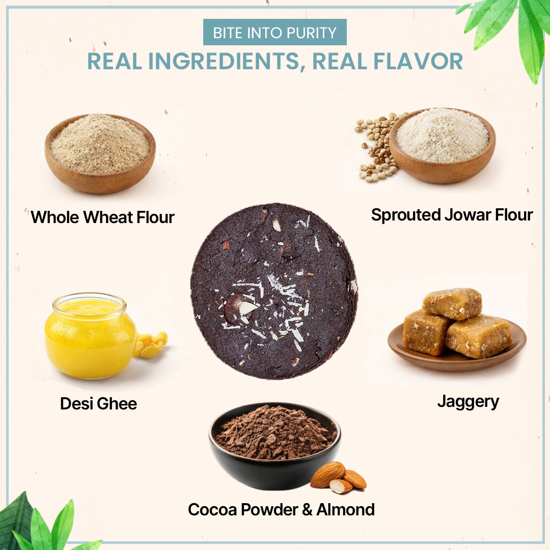 Whole Wheat Flour (Atta), Sprouted Jowar Flour (19.7%), Desi Ghee (24.6%), Jaggery, Milk, Cocoa Powder, Almond.